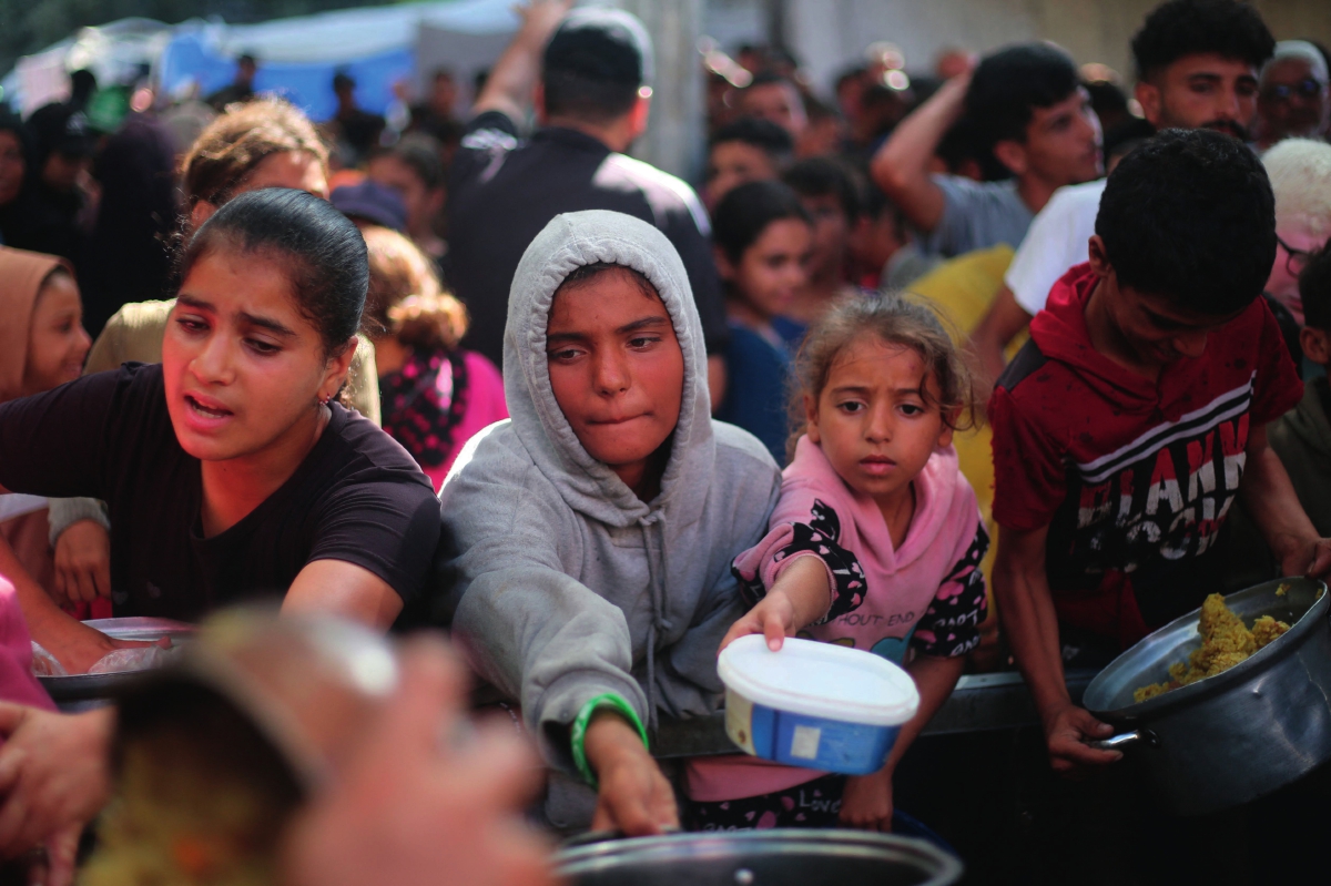 10月21日,加沙难民营等待领取食物的无家可归儿童 CFP 图