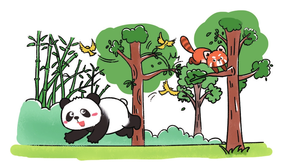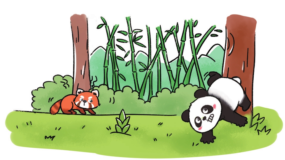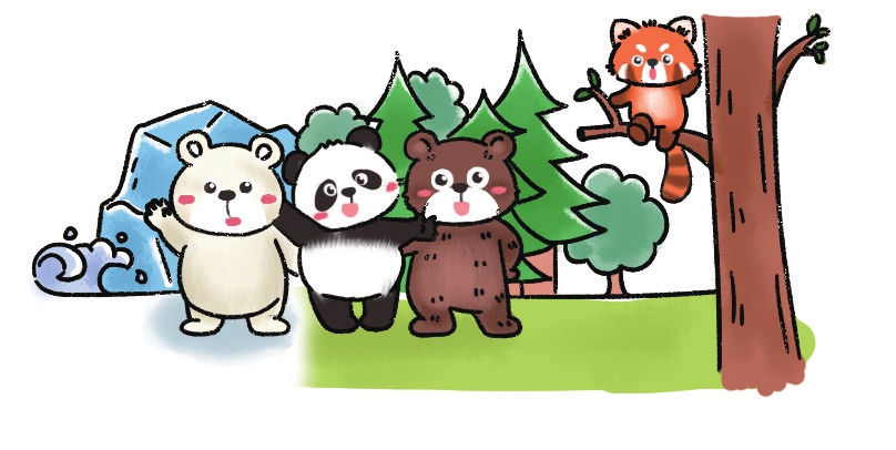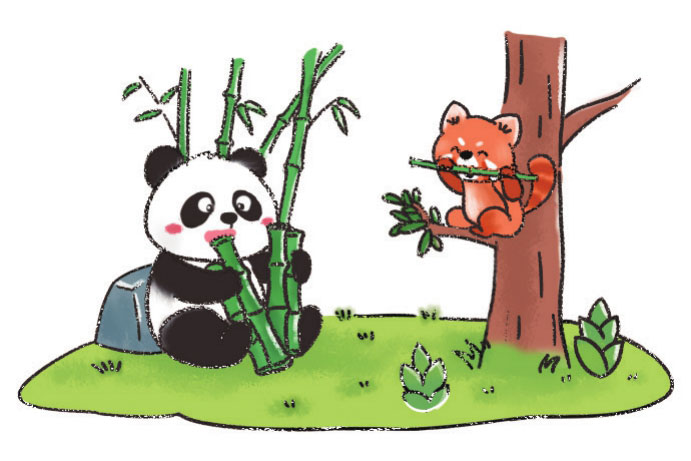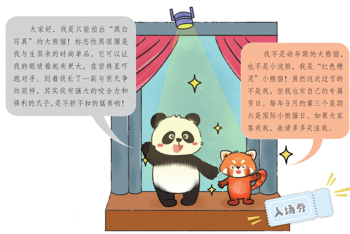 前两天,地球上那个最著名的“黑白胖子”过节啦!每年的10月27日是国际熊猫日。为了庆祝这一天,森林剧院排演了一出新剧目。演员除了节日主角大熊猫外,还有一位“特邀嘉宾”—小熊猫。两位都顶着“熊猫”二字,它们是亲戚吗?它们的相同点有哪些,不同点又是什么呢?来来来,入场券给你,快去森林剧院寻找答案吧。