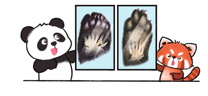 它们的爪子上都有一根特化的腕骨—伪拇指。伪拇指不是真正的手指,但也能像手指一样灵活地抓握竹子,帮忙把竹子送进嘴里。它们在演化过程中不约而同地获得“第六指”,也算是一种缘分了。
